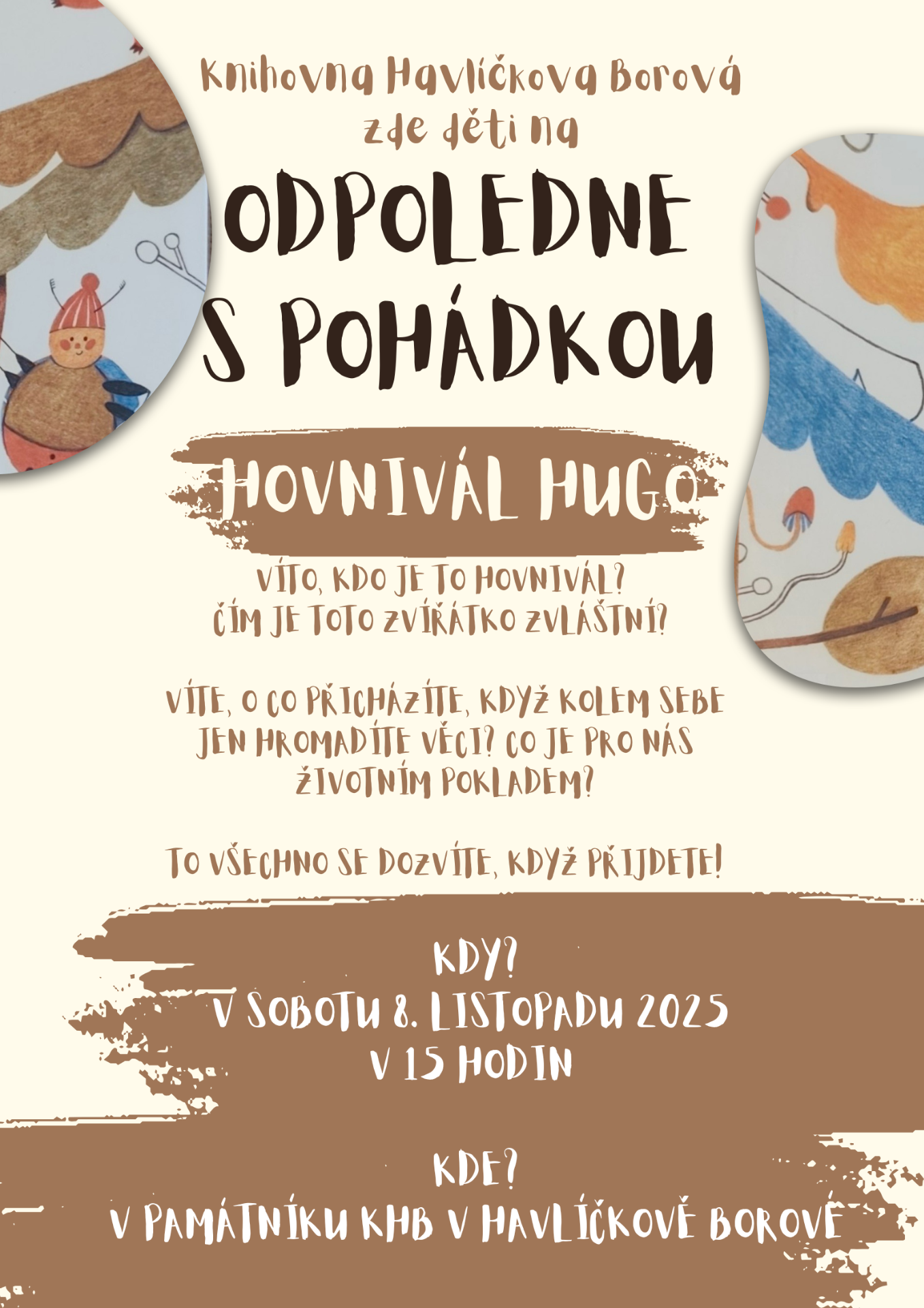 Srdečně všechny zveme děti na Odpoledne s pohádkou, tentokrát budeme s knihou Hovnivál Hugo. Sejdeme se v sobotu 8. listopadu 2025 v 15 hodin v knihovně. Budeme si nejen číst, ale také tvořit, tentokrát něco jedlého :)